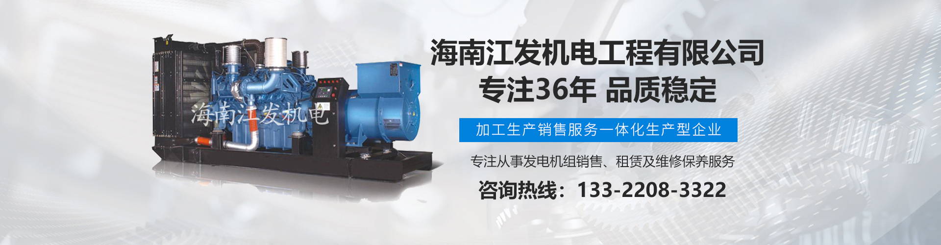 海南江發(fā)機電工程有限公司是海南經(jīng)營進口、國產(chǎn)柴油發(fā)電機組、是海南較早、較大的銷售、租賃服務及維修保養(yǎng)專業(yè)機電公司。從1985年開始,公司勵精圖治、銳意進取、不斷創(chuàng)新,不僅在海南機電行業(yè)領域中具有先進技術、完美管理、誠信服務,高超的產(chǎn)品質(zhì)量和性能,而且還有合理的產(chǎn)品性能價格比,令客戶滿意以及完善的支持保障。 在客戶心目中,江發(fā)公司不僅具有最好的企業(yè)信譽,還是客戶最信賴的誠信單位,而且會帶給客戶永遠的光明和豐厚回報。